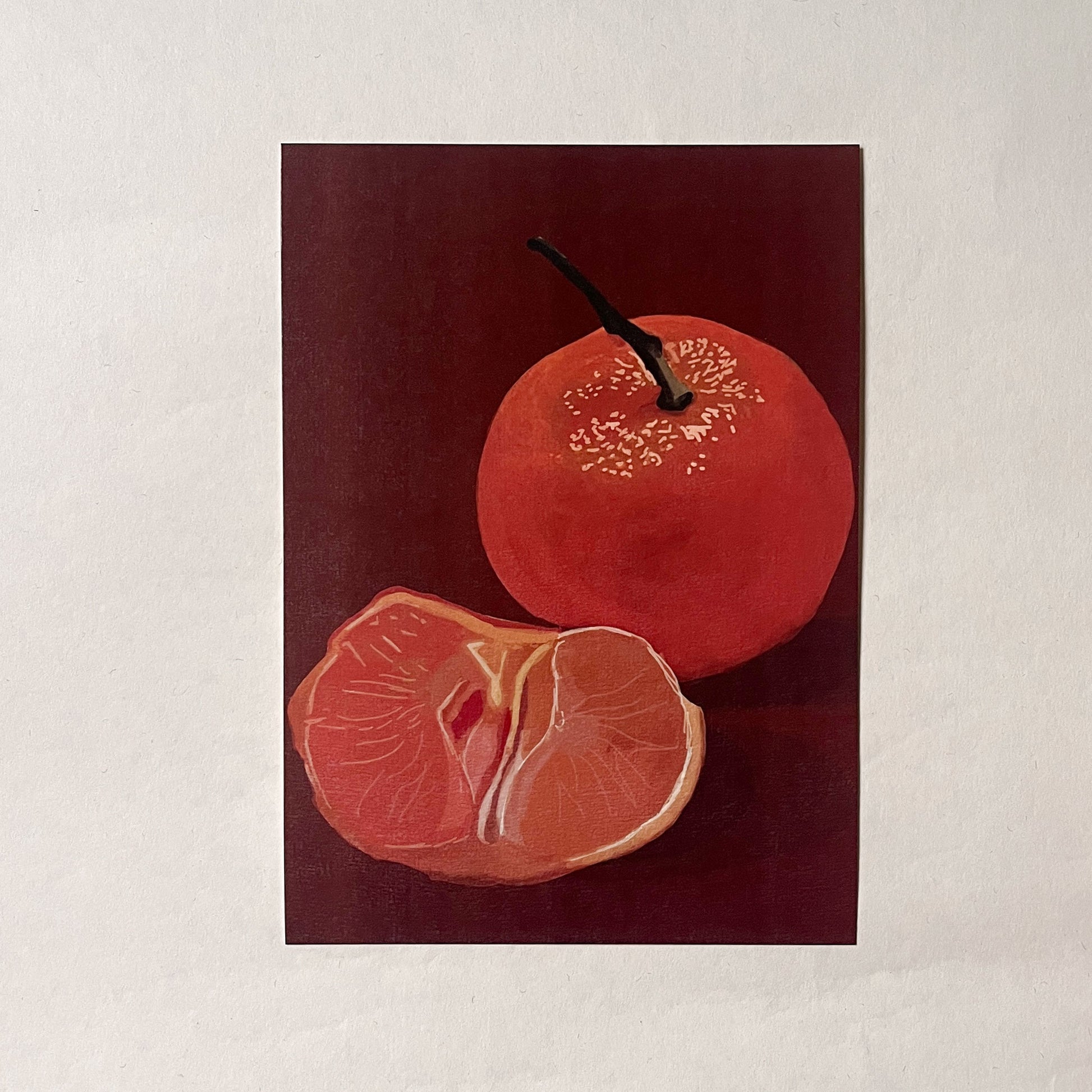 Celebrate the tender language of fruit with Kinnu: A Love Language, an art print capturing the warmth of winters. A freshly peeled kinnu rests against a rich maroon backdrop, glowing in golden sunlight, a scene that recalls afternoons with sticky fingers, laughter, and the quiet love of parents who peel oranges so you don’t have to.